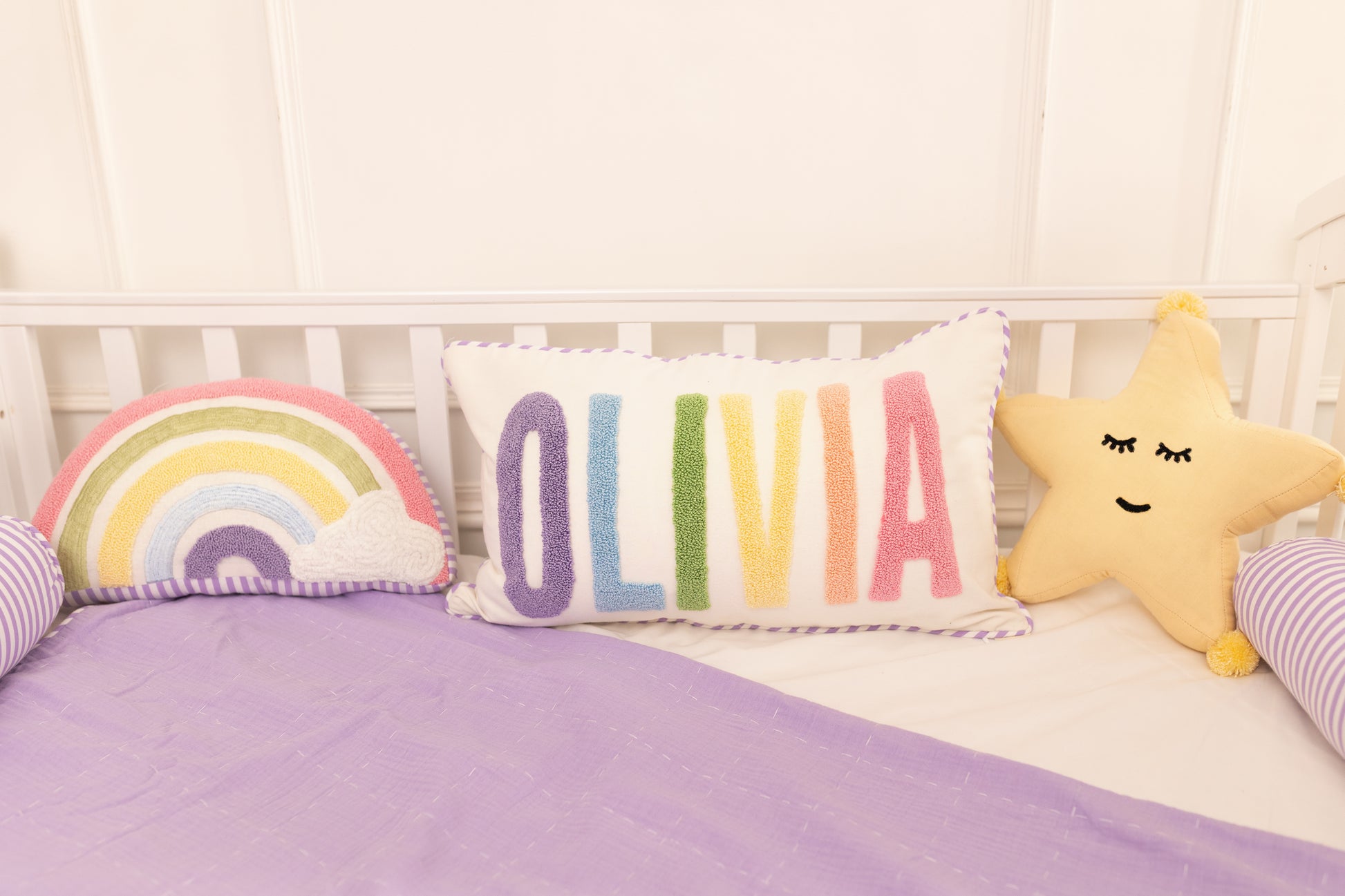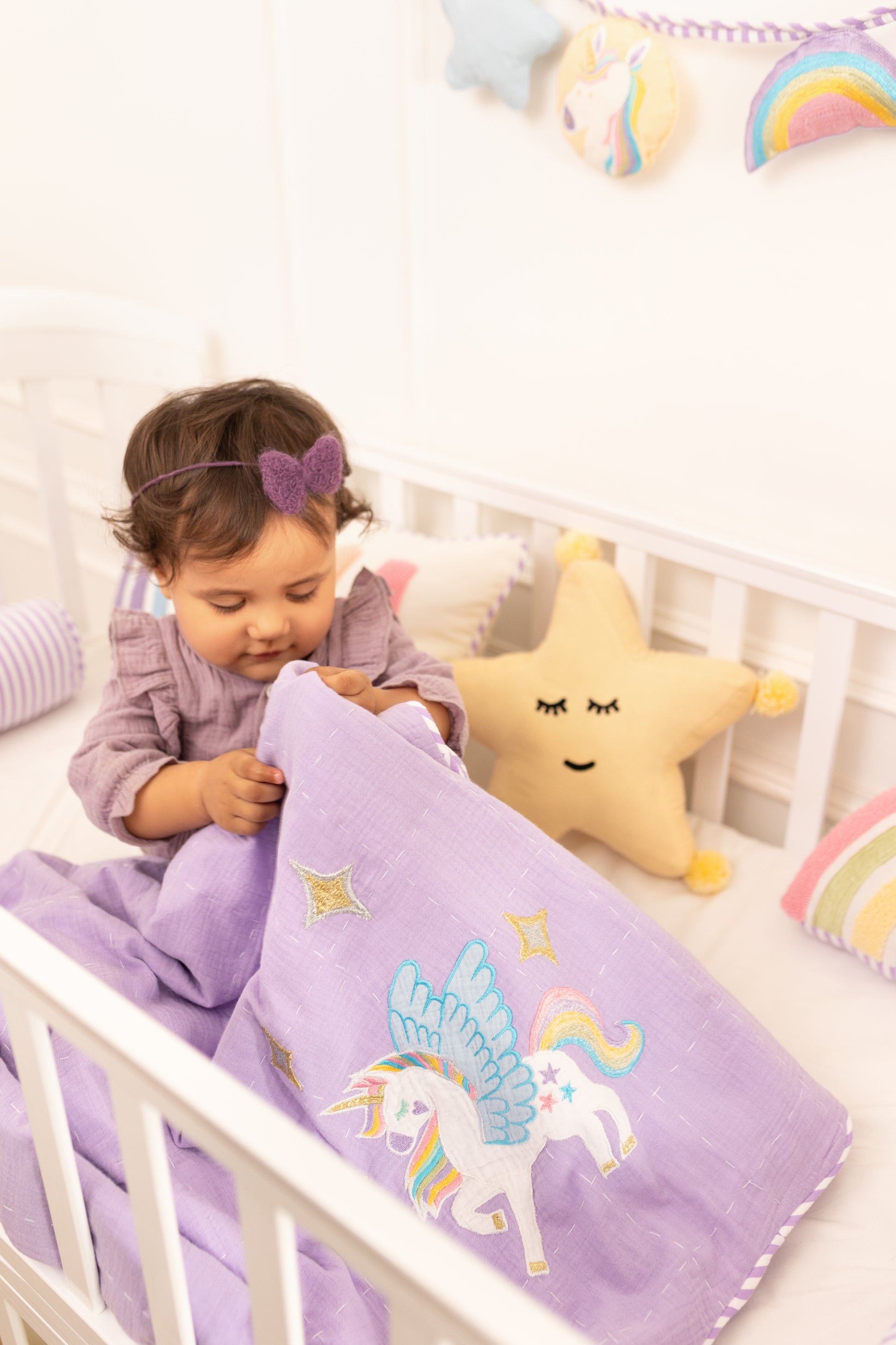 ★ Wrap your little one in comfort with this 100% cotton blanket, lovingly handcrafted with a whimsical unicorn design on one corner and soft lavender-and-white stripes on the reverse.